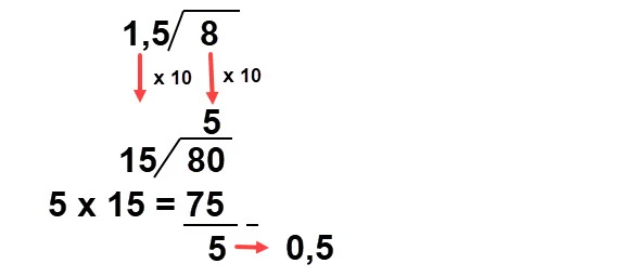 Dalam pembagian pada bilangan desimal, tanda koma pada bilangan sisa hasil bagi berada pada posisi yang sama seperti tanda koma pada bilangan yang dibagi. Ketika kita menghitung, kita memisalkan bahwa 0,8 l adalah 8 dl dan 2,5 l adalah 25 dl. Hal ini berarti sisa 1 adalah 0,1.